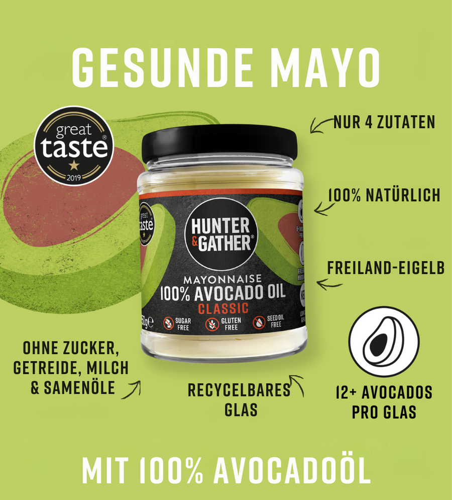 Unsere Hunter & Gather Mayonnaise wird nur mit 100 % Avocadoöl hergestellt – ohne Öl-Mischungen. Sie ist zudem zuckerfrei, kohlenhydratarm und reich an gesunden einfach ungesättigten Fettsäuren. Perfekt also für Paleo-, Keto-, Low-Carb- oder Real-Food-Lifestyle.