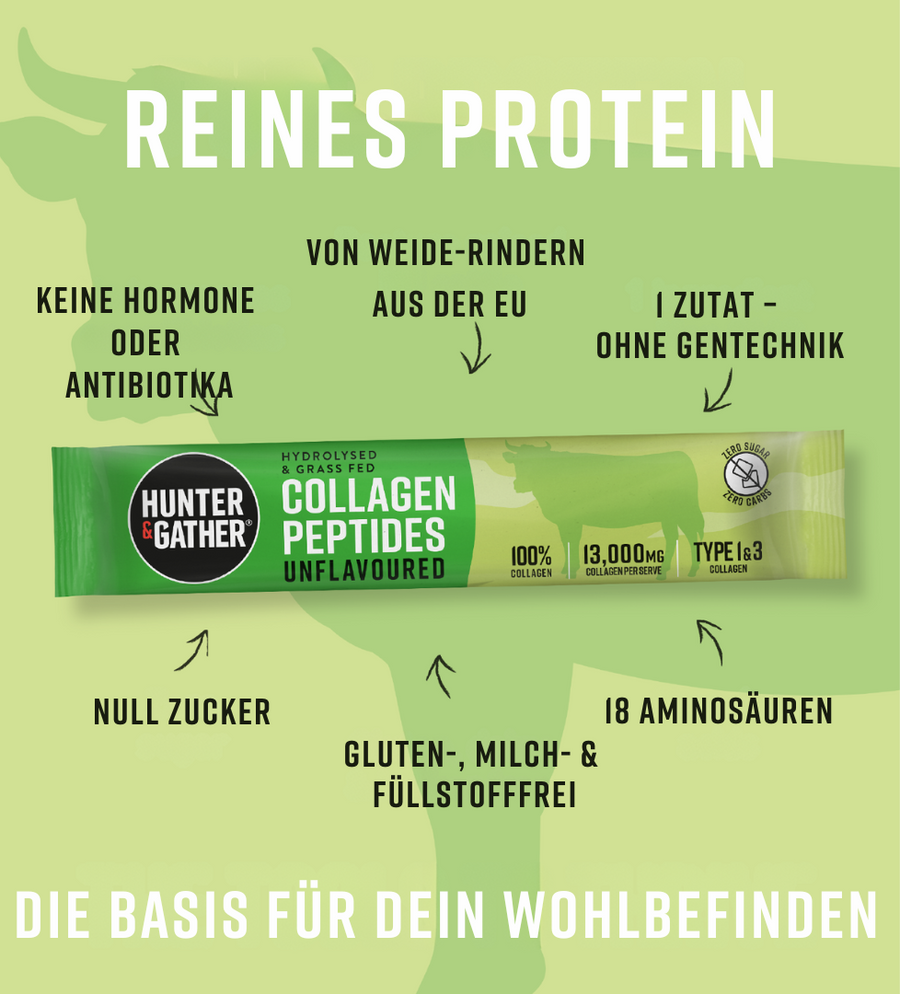 Aber es gibt gute Nachrichten: Mit unserem hochwertigen Hunter & Gather Kollagenpulver kannst du deinen Körper gezielt unterstützen. Einfach 1–2 Scoops täglich in deinen Kaffee, Smoothie oder Wasser mischen und dich jeden Tag rundum wohlfühlen.