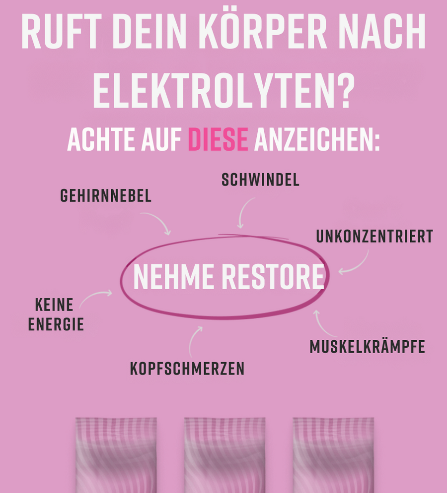 Ein Elektrolyt-ungleichgewicht macht sich schnell bemerkbar: Konzentrationsschwierigkeiten, Kopfschmerzen, Müdigkeit, Muskelkrämpfe oder Schwindel sind typische Anzeichen. Wenn du dich so fühlst, ist Restore® deine Antwort. Unser Mix aus natürlichen Elektrolyten hilft dir, deine Speicher aufzufüllen – damit du dich wieder fokussiert, wach und energiegeladen fühlst.