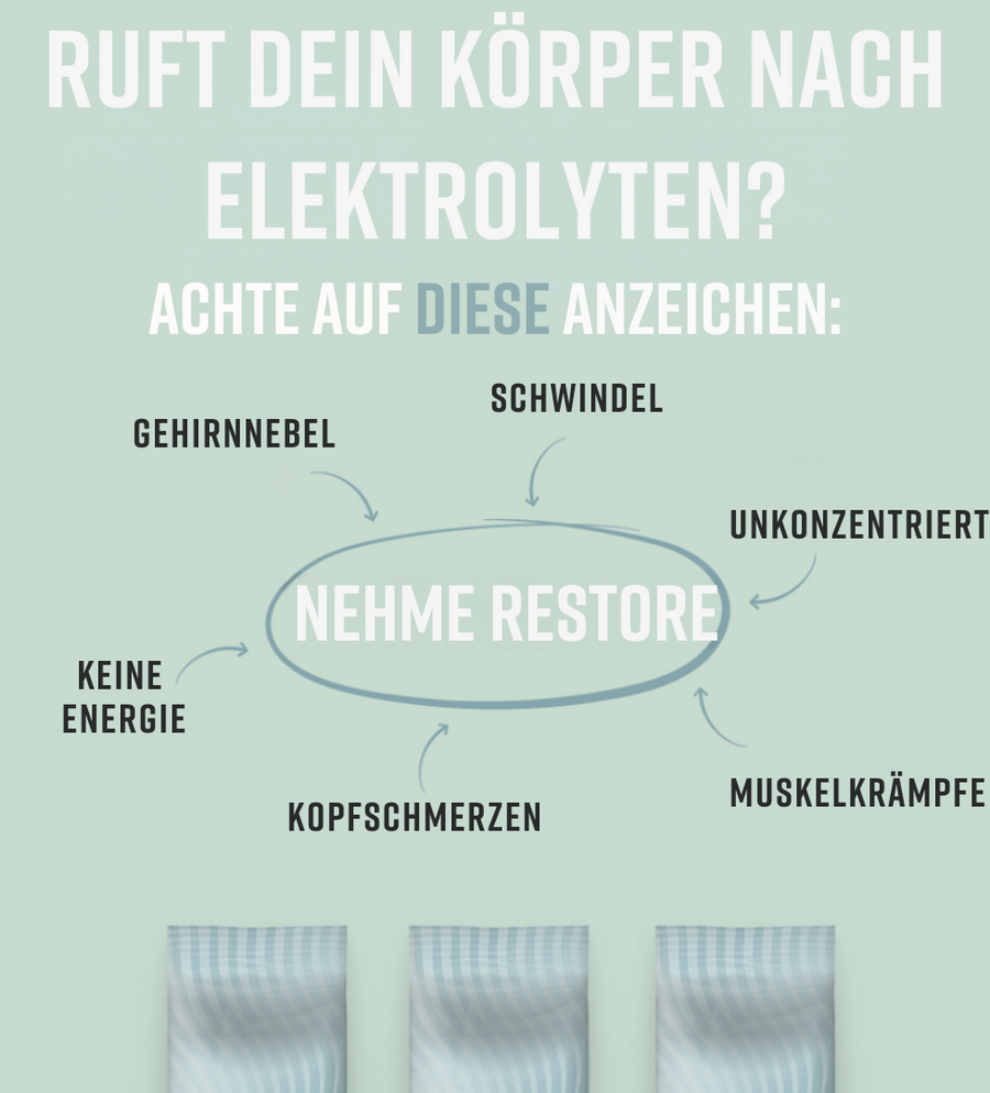 Ein Elektrolyt-ungleichgewicht macht sich schnell bemerkbar: Konzentrationsschwierigkeiten, Kopfschmerzen, Müdigkeit, Muskelkrämpfe oder Schwindel sind typische Anzeichen. Wenn du dich so fühlst, ist Restore® deine Antwort. Unser Mix aus natürlichen Elektrolyten hilft dir, deine Speicher aufzufüllen – damit du dich wieder fokussiert, wach und energiegeladen fühlst.