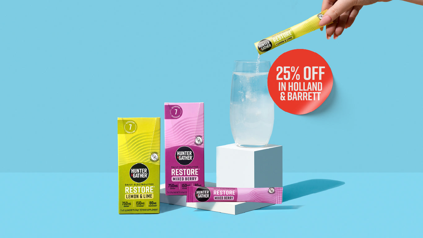 Exciting news! Our exclusive Restore Daily Electrolytes are now available in a convenient 7-pack at Holland & Barrett – perfect for on-the-go hydration.
