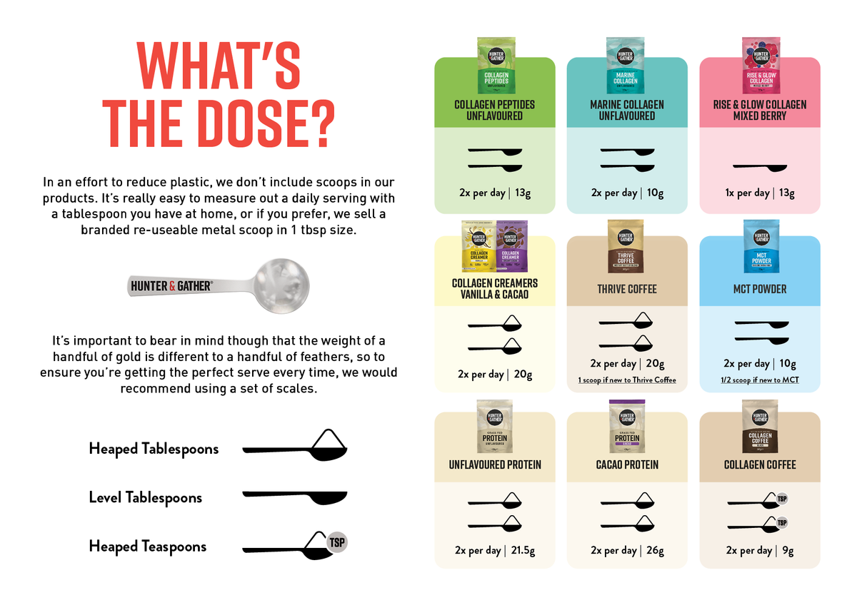 Each serving of Collagen Coffee contains 5g of grass fed collagen peptides, while each serving of Bone Broth provides 15g of protein, including 13g of collagen. These amounts are delivered per serving, as part of two separate drinks taken at different times of day.