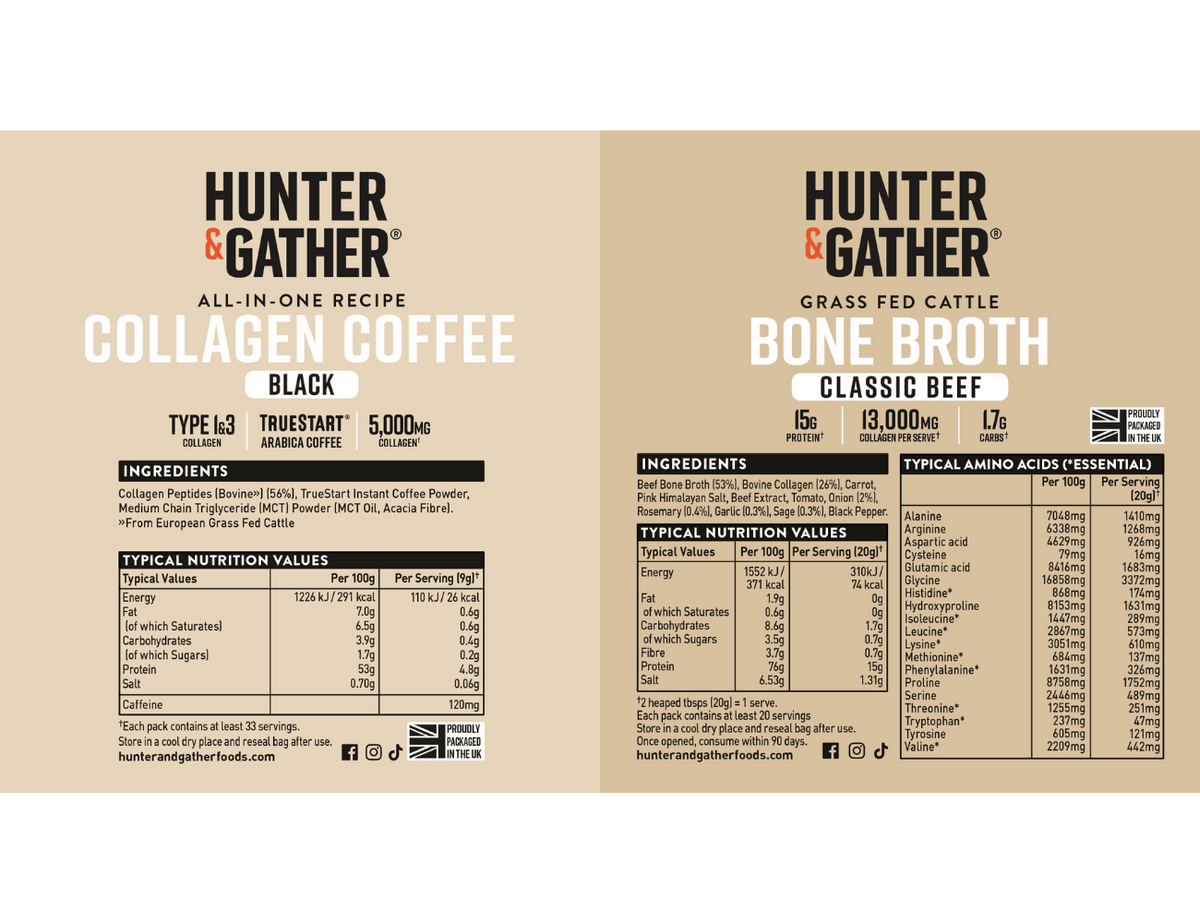 Collagen Coffee and Bone Broth often suit different times of day. Collagen Coffee provides a smooth Colombian Arabica coffee with naturally occurring caffeine to help increase alertness and concentration in the morning, while Bone Broth is a warming, savoury drink that’s high in protein and essential amino acids, making it ideal for winding down in the evenings.