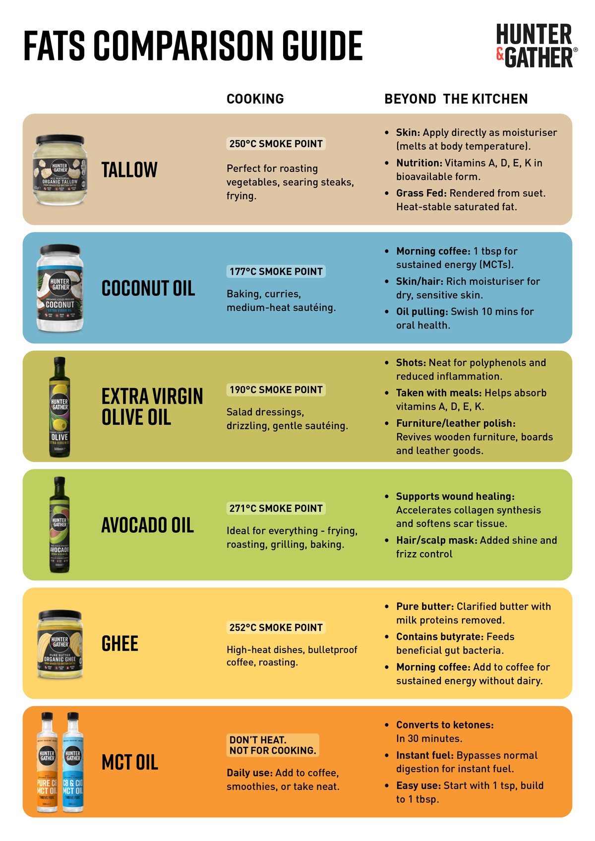 Olive oil (Extra Virgin) has a smoke point of around 190C, which is lower than that of other cooking oils. We therefore recommend using Extra Virgin olive oil as a cold use oil and option for another oil with a higher smoke point for cooking (Avocado 255C or Ghee 250C for example).