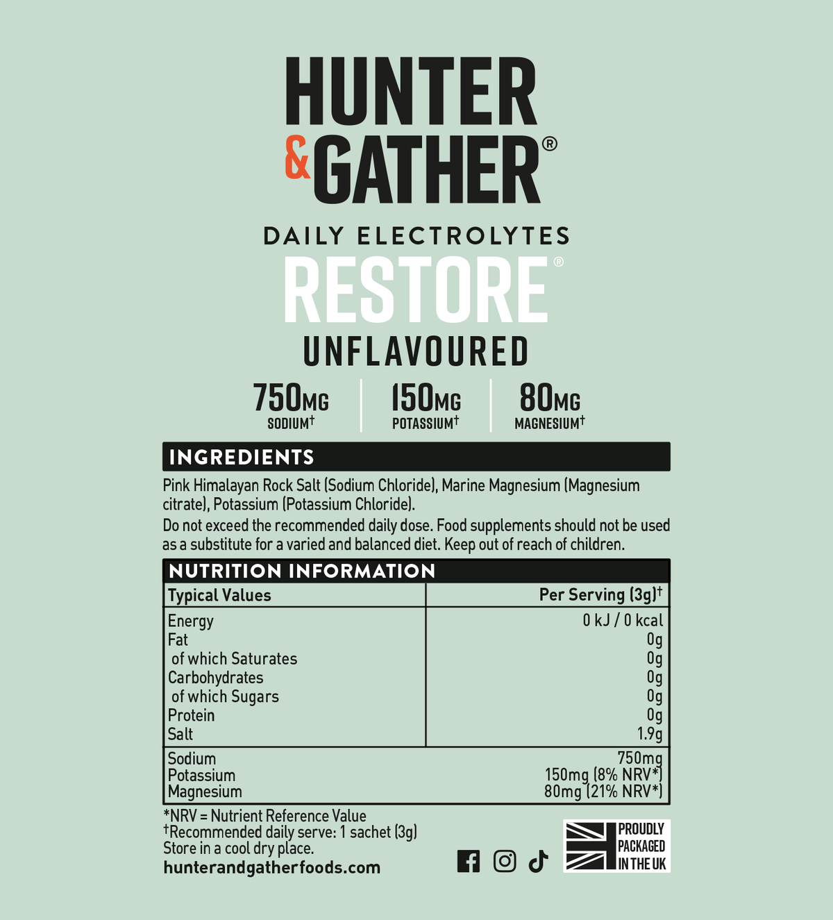 In an age where modern diets often fall short due to soil depletion and poor eating habits, Restore is here to help you bridge the nutritional gap. We've scoured the earth to bring you the purest, most potent minerals nature has to offer. Each sachet delivers a mighty 750mg of sodium from Pink Himalayan Rock Salt, 150mg of potassium from natural Potash Salt, and 80mg of magnesium from marine magnesium. With Restore, you're not just hydrating – you're reconnecting with the primal power of the earth's essential minerals.